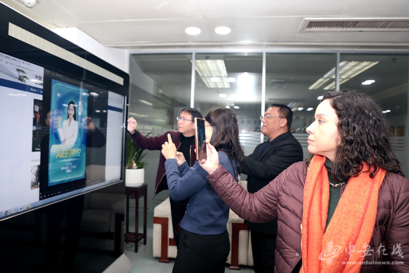 研修班一行現場觀摩了中安在線網站、中安英文網以及中安新聞客戶端等平臺的功能演示,在融媒體“中央廚房”觀看了安徽文旅英文宣傳片,并走進全媒體演播室,實地了解新聞內容從策劃、采集到制作、分發(fā)的全流程一體化運作模式。參觀過程中,集團的數字主持人技術引起大家濃厚興趣,充分展示了集團在智能媒體融合方面的創(chuàng)新探索。